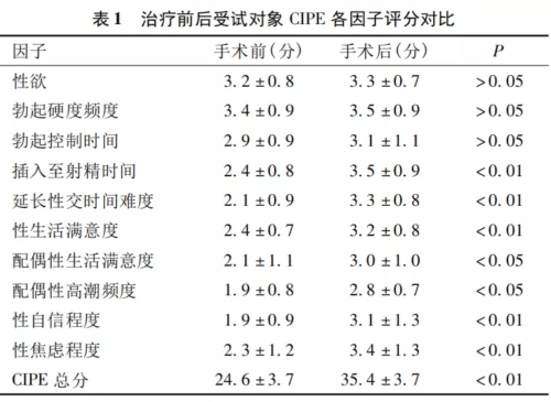 国内某三甲医院针对行包皮环切术的 126 例患者(诊断为原发性早泄且包皮过长)进行了中国人早泄病人性功能评价表( CIPE) 对患者进行问卷调查,评估患者术后的性生活质量,结果如下: