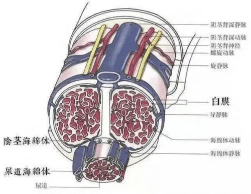 那我们就先认识一下小老弟是怎么博起的,音茎是由3个圆柱形的组织构成的:图中最上面的两个圆柱体是“音茎海绵体”,而靠近腹部的圆柱体叫做“尿道海绵体”,海绵体内有许多海绵体小梁和腔隙。