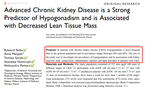 [1]Skiba R, Matyjek A, Syry?o T, et al. Advanced Chronic Kidney Disease is a Strong Predictor of Hypogonadism and is Associated with Decreased Lean Tissue Mass. Int J Nephrol Renovasc Dis. 2020;13:319-327.