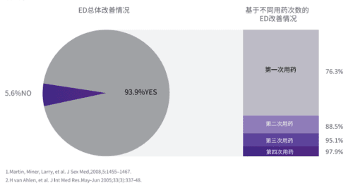 Mathers等研究发现不同剂量的伐地那非每日服用或规律服用一年后,勃起功能有明显改善,且停药4周后仍有效果。一项针对29358名德国ED患者研究显示,73.6%的患者在第一次服药后勃起情况得到改善,每多用药一次改善率更高,在第四次服用后97.9%的患者勃起功能得到改善。