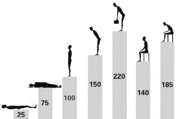 ▲ 不同姿势腰部受力表(单位千克)