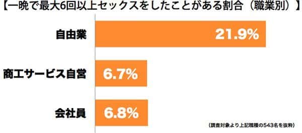 分职业来看的话,自由职业者一晚上来过6次的比例突破两成。可能是时间比较宽裕吧。 据说男人射一次精和用最快速度跑100米一样累。考虑到别影响第二天工作上的表现,来三发也就差不多了吧,保重身体啊兄弟~