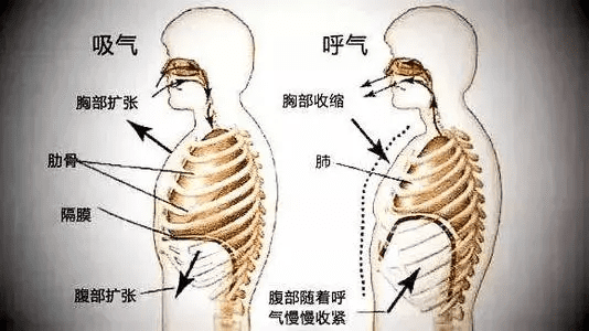 而腹式呼吸,就是改变肺的扩张方式和方向。让肺向下扩张,由于胸腔的下面是腹腔,意味着腹腔要为肺的扩张去挪点空间,所以腹式呼吸吸气时我们要把腹腔扩张。呼气时,保持平静,胸腔不动,并且肺在扩张的时候是向下扩张的,此时腹部内收,用腹腔加压,类似一个装了水的气球,你从周围去挤压它,它的体积不变,高度自然增加,就会向上推压肺部,排出肺部的空气。