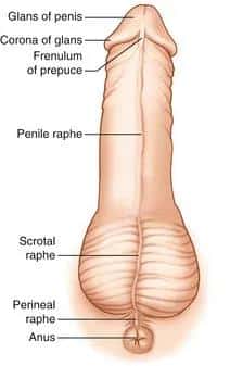 后部为阴茎根,附着于耻骨下支、坐骨支及尿生殖膈;中部为阴茎体,呈圆柱状,悬垂于耻骨联合前下方;前部膨大为阴茎头,这里神经纤维丰富,是最敏感的部位,头尖端有矢状位的裂口叫尿道外口,头与体交界处有一环状沟称阴茎颈或冠状沟。