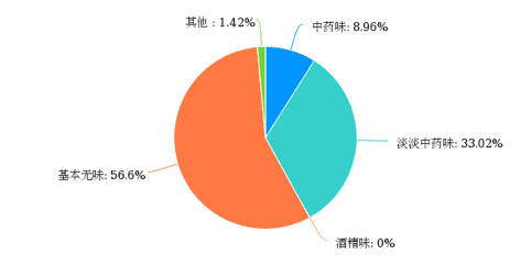 在“用户对产品气味的感受”上,超过一半(56.34%)的用户认为产品基本没有什么特殊气味,也有三成(33.33%)用户认为产品有淡淡的中药味,较少用户(8.92%)认为产品有中药味,没有用户认为产品有酒精味,还有一些用户反馈产品有“淡淡的香味”。