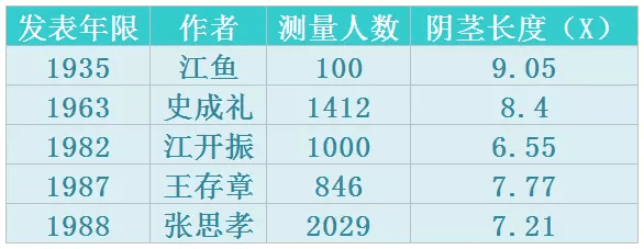 表1是不同学者测量的自然状态下的中国男性平均长度,虽说年代久远,但依然可以作为当今我国成年男性长度的判断基础。表2来自吴伟德教授的长度的测量方法及误差研究,它显示出自然状态下中国成年男性的长度平均值是8.20cm,Duang起之后的状态下平均长度是13.65cm。
