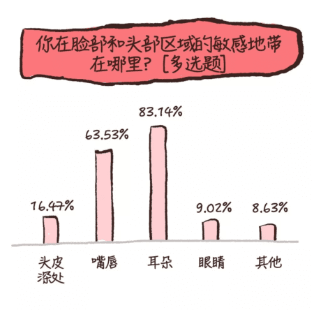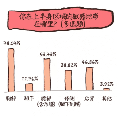 “手臂关节,手指”、“腹部,尤其是肚脐”,以及 90后女孩@Icy说,“我最敏感的地方是手肘内侧,题目里竟然没有!是一次他在舔的时候偶然发现的,然后就一发而不可收,现在不仅是舔,只要他轻抚这里,就会立刻有反应,仿佛找到了开关。”