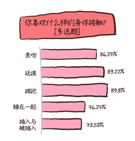 知识有数据调查显示:**89.8%**的人们喜欢“拥抱”,89.22%的人们喜欢“抚摸”,还有86.27%的人喜欢“亲吻”,“插入和被插入”排列最后一项,占比73.53%。