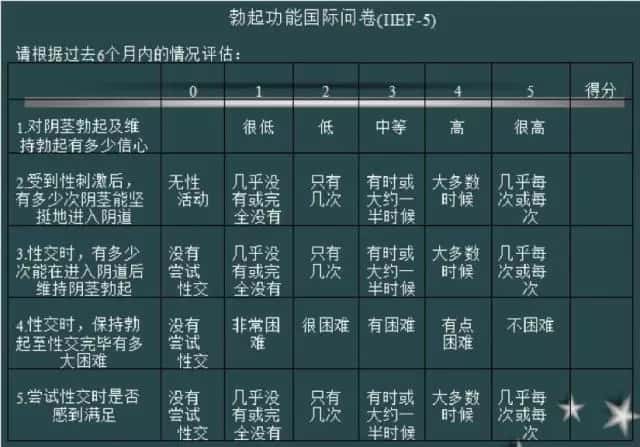 IIEF-5符合勃起功能障碍(ED)的定义,也是简单有效的ED筛选工具,标准如下: