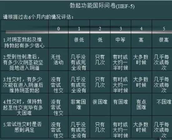 IIEF-5符合勃起功能障碍(ED)的定义,也是简单有效的ED筛选工具,标准如下: