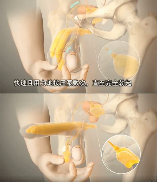 “那啥”前,只需用手偷偷按压在阴囊的开关,假体储液囊中的液体就会充入假体,阴茎就会迅速达到坚挺的勃起状态。