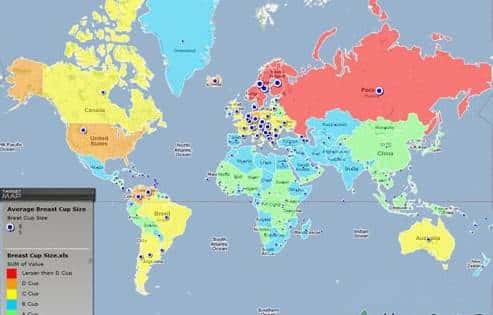 地图以颜色区分罩杯尺寸,红色代表大于D罩杯,橙色则是D罩杯,黄色为C罩杯,蓝色是B罩杯,而绿色则为A罩杯。