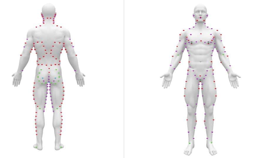绿色的点,代表用吧唧,比如臀部的臀大肌外侧,这个肌肉和肌肉之间相连的地方,另外,大腿和小腿之间,膝盖的反面,也很适合。