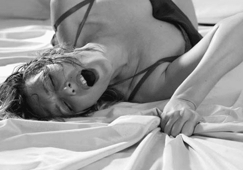 “我用力地呼吸,大口喘气,骨盆变得僵直而迭起痉挛,我的脸孔因颦蹙而扭曲,身体僵硬,最后,高潮便很戏剧性地迅速退去。”