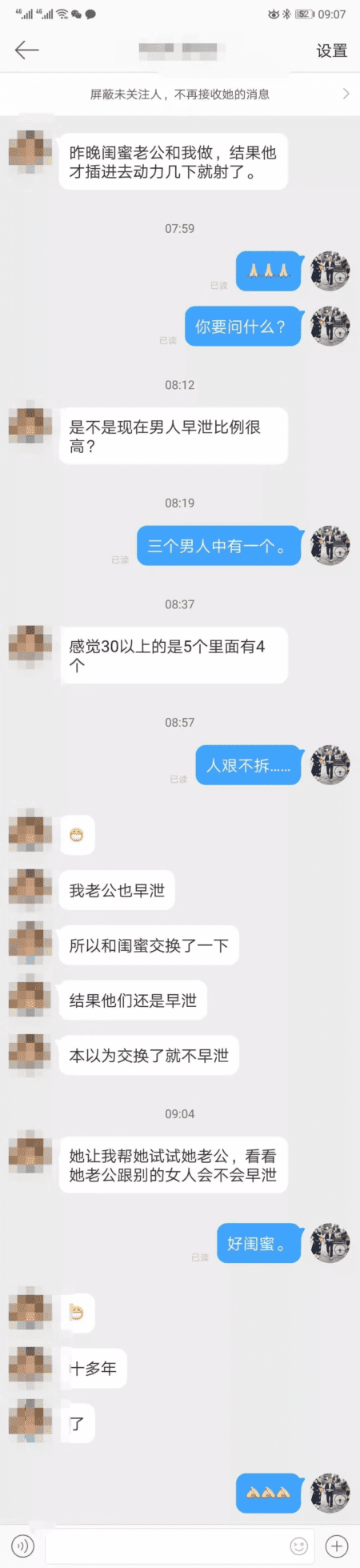 作为三十岁的男性看到早泄这个词,总是一身冷汗。而对于故事中的女性:老公可能是摆设,闺蜜才是真爱。
