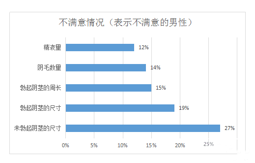 在对自己丁丁不满意的人当中,对各项不满意的情况如下:未勃起丁丁尺寸27%、勃起丁丁尺寸19%,勃起丁丁周长15%、yinmao数量14%和jingye量12%。