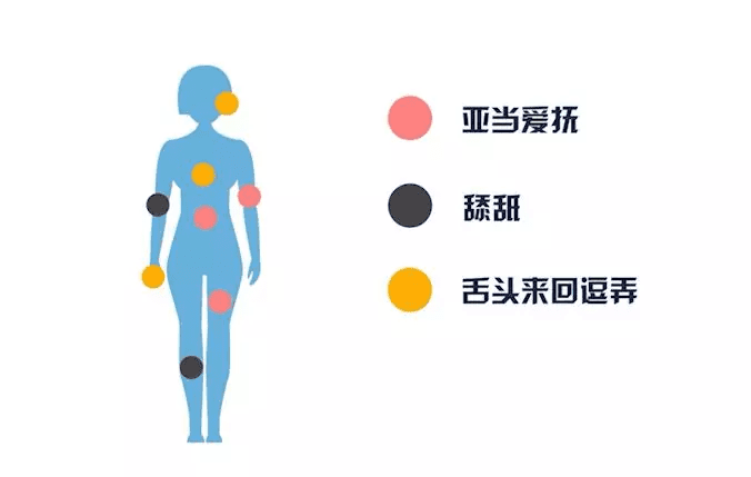 后背,腰侧,腹部,手臂内侧,大腿根都可以使用亚当爱抚(亚当爱抚:只用指腹若有似无的触摸肌肤,轻柔缓慢滑过),造成痒痒的感觉;距离头部较远的部位,可以用舌头一边舔舐一边注视对方的眼睛,造成暧昧缠绵的感觉;耳侧、耳垂、指尖,可以选择用舌头来回逗弄……