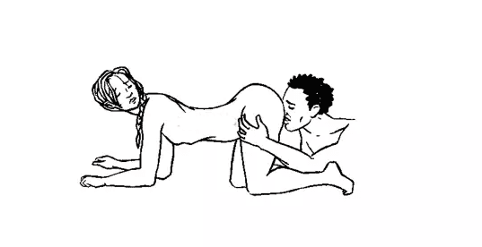 女生四肢着地趴在床上,男生趴在其身后,像恐怖电影《人体蜈蚣》那样来口。不要被吓到,其实很多人用这个姿势来舔菊花…