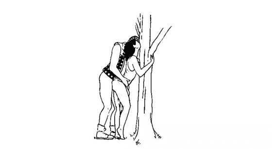 姿势相当简单,她几乎可以直立自己的身体,上半身前俯,只要前面有一颗树、一面墙、一根电线杆、厕所隔间的隔板,所有垂直可以扶着稳定身体的东西。(或者两手扶住膝盖)