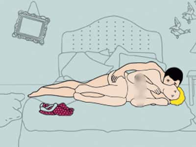 2、若女子侧卧在枕头上,他跪在你的臀后,上身向前倾,以膝盖分开你的双脚进入。由于你的两边大腿紧靠着,可带给他更大快感。此外,这角度可进入更深,特别适合阴茎较短小的男士。让他能方便刺激你的G点时,也可爱抚女子的胸部,促进女子高潮到来。