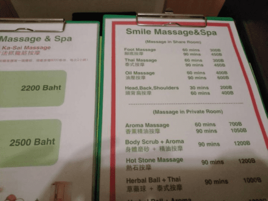 等小编再来到店门口时,店已经开门了,于是小编便脱鞋进入店内,迎面欢迎小编的是俩中年阿姨和一位年轻的泰国mm。互相说完“萨瓦迪卡”后,就提供了各个项目的价格表。