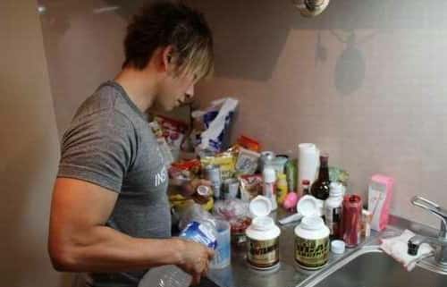 看到这些满满的罐子就知道他的早餐时间和别人极不一样。为了要维持较常人发达的肌肉,起床第一件事就是喝入一杯宝矿力水得、维他命B粉以及支链氨基酸粉(BCAA),接着边看电视边进行肌肉训练。