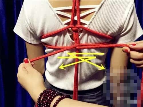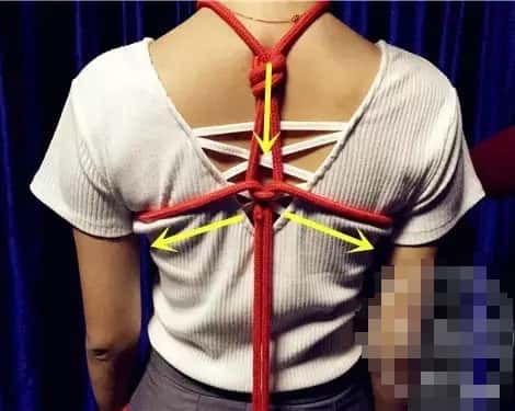 ⑤ 当绳子穿过脖子后方的结圈,拉紧后,其实是一个平衡力,同时也不会让被束缚的人脖子太难受。然后将两条绳子分别从腋下绕到前面。