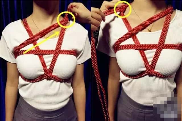 ⑥ 从右肩直接往左腋下拉,然后绕到背后,打结,收绳。