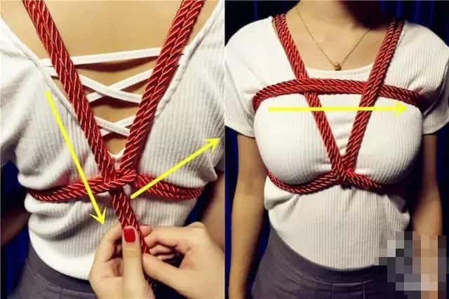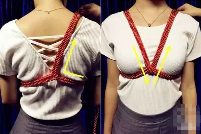 ③ 将两根绳从背后往右肩上搭,一直到前胸,绕过下胸围的绳子,再搭到右肩到背后。
