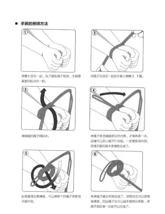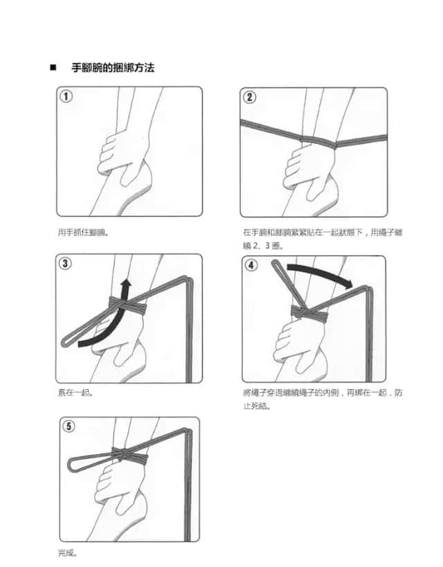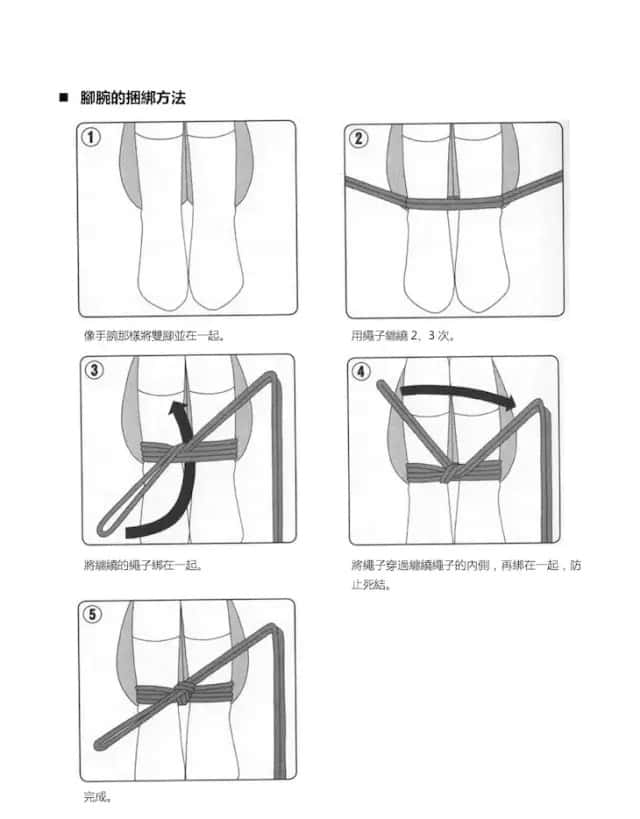 关节捆绑是所有捆绑的基础,万变不离其宗,在此基础上可以衍生出无穷多的绑法,全看大家的想象力了,适用部位有脚部踝关节、膝关节、手部肘关节、腕关节。