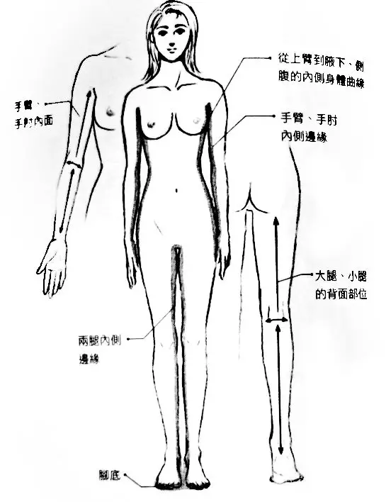 以「向前看齐」的站立姿势为例,隐藏于内侧的部位,其实是女人非常重要的敏感带,从手臂和手肘内测边缘,上臂到腋下往侧腹的内侧身体曲线,以及两腿内侧、脚底等处都可以抚摸。