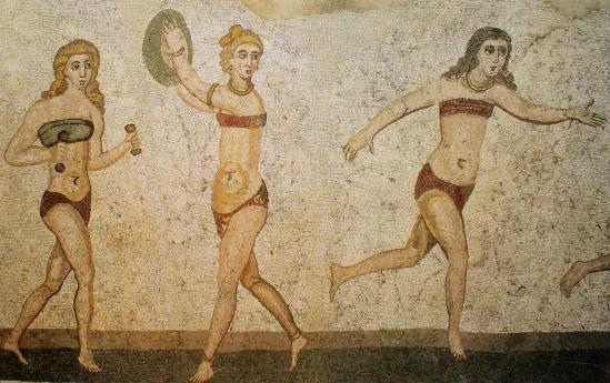 毕竟,最早可以追溯到史前文明,人类的祖先就是如此穿衣的。在古罗马时期的某个别墅内部,甚至就出现了,身着极简单的遮羞服装,参加体育运动的年轻女子图案。因为实在太像如今的三点式泳衣,考古界干脆戏称她们为“比基尼美女”。