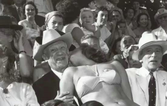 风流艺术家毕加索,同样钟情于比基尼。1956年8月,一个身着比基尼的热辣女郎,平躺在看台上,当众给这个76岁的老者,一个激情的热吻。