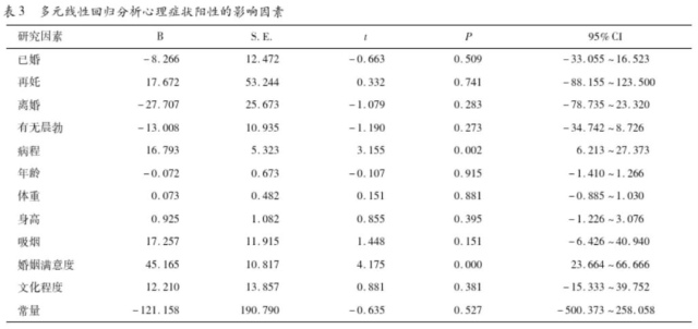 而ED患者的病程,及婚姻满意度是影响SCL-90评分的影响因素(P<0.05)。
