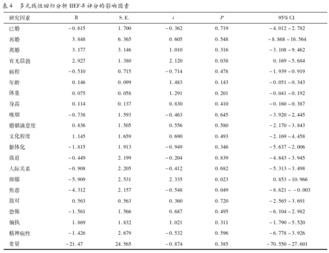 而按照IIEF-5问卷调查的评分中显示,ED患者有无晨勃及抑郁、焦虑的心理状态是IIEF-5评分降低的危险因素(P<0.05)。
