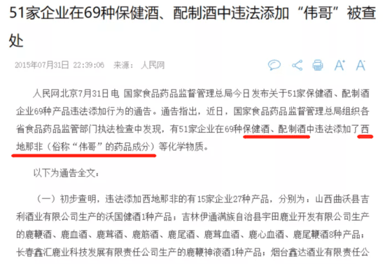 并且在早几年,我们国家就在执法检查中发现,有51家企业在69种保健酒、配制酒的产品名称、标识、标签上明示或暗示壮阳、性保健等功能。