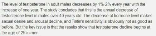 而美国德克萨斯大学心理学系研究人员发现,成年男性的年龄每增加一岁,睾丸激素水平就会降低1%~2%,研究得出,这种情况是在男性40岁以上每年睾酮水平的下降情况,也就是说,激素水平的下降,使得性欲和性唤起下降,阴茎的敏感度显然不如以前。