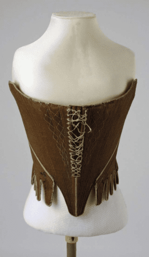 「其质料为暗黑色丝绸,内有细棉衬里,设计极端复杂,针脚细密,用了20根鲸骨,140条系带线。」