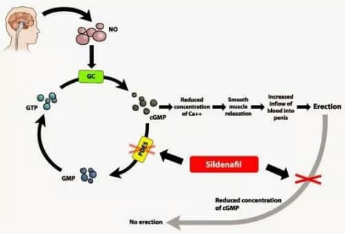 西地那非可抑制磷酸二酯酶5(PDE5),以增加阴茎海绵体内环磷酸鸟苷(cGMP)水平,当cGMP聚集时,海绵体平滑肌松弛、充血,丁丁勃起。