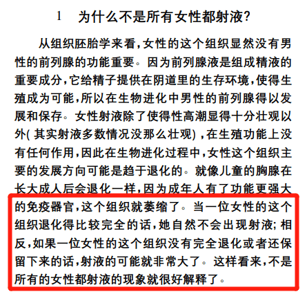 甚至,还有学者指出:从组织胚胎学角度来看,女性射液的现象是一种组织退化不完全的现象,因此,能不能潮吹当然也就因人而异了。
