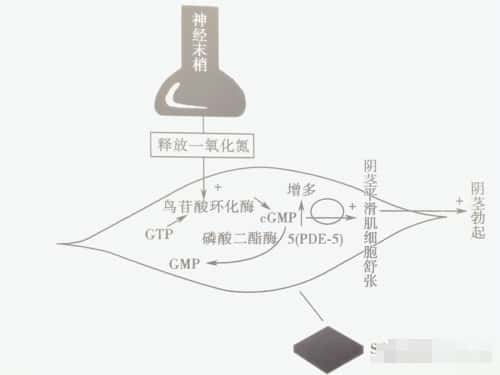 性刺激作用于视、听、嗅、触觉和唤醒后,中枢神经系统发出性冲动并传到给丁丁,或直接刺激外生殖器使得副交感神经兴奋,释放神经递质(NO),作用于血管内皮和平滑肌细胞,cGMP水平增高,使得丁丁海绵体平滑肌松弛,动脉供血大量流入丁丁海绵窦,使丁丁膨胀;