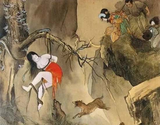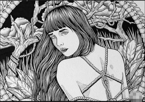 明治维新之后,手铐代替了绳子,警察不再用绳缚来捆绑犯人了。但是绳艺在当时,确实已经带上了情色的意味——那个时候日本有个很有争议的画家,据说是日本昭和SM第一人,名字叫伊藤晴雨(1882年3月3日-1961年1月28日),他很精准地捕获了绳艺的唯美精髓,画了不少以绳缚为元素的作品: